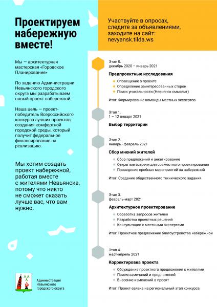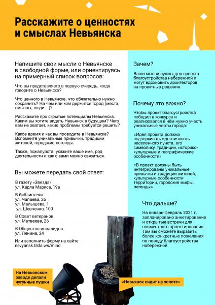 Для участия в конкурсе необходимо подготовить проект благоустройства одной из общественных территорий, который учитывает мнения и пожелания жителей города Невьянска. Процесс это длительный, включающий в себя несколько этапов, один из которых уже начался: нулевой этап стартовал в декабре. На данном этапе ведется предпроектное исследование, поиск уникальности. Это те самые размышления о родном городе на сайте «Невьянск смыслит», о котором мы писали в одном из предыдущих выпусков «Звезды».