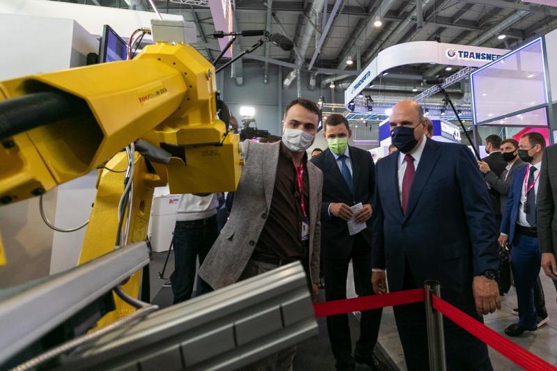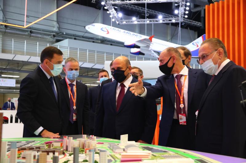 Стенд Свердловской области премьер-министру представил губернатор Евгений Куйвашев. В этом году региональная экспозиция объединена с экспозицией Екатеринбурга. Здесь на площади более чем в одну тысячу квадратных метров представлены знаковые и перспективные уральские проекты.