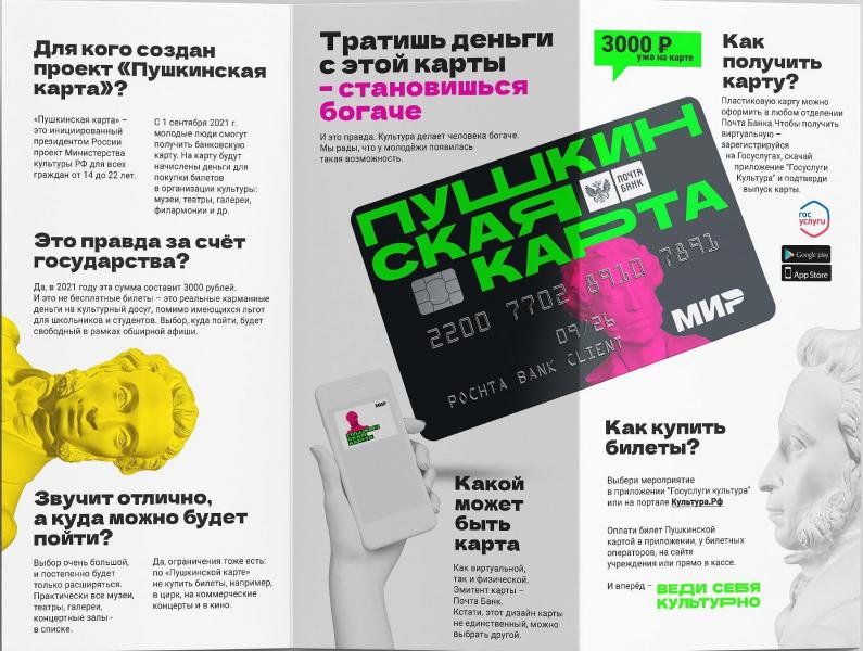 1 сентября 2021 года стартует всероссийская культурная программа «Пушкинская карта», призванная популяризировать среди молодёжи культурные мероприятия по всей стране.