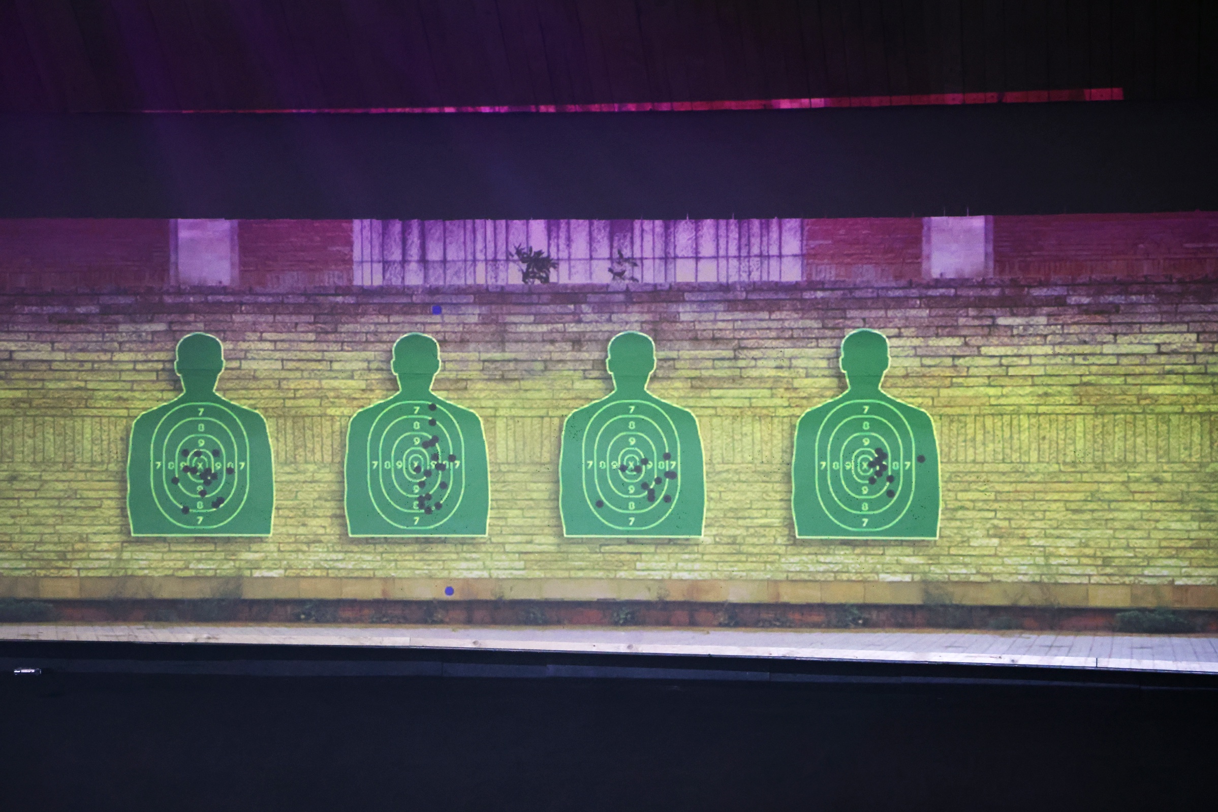 Четверо бойцов ОМОН "Русич" выходят на огневую позицию. В тире гасится свет, и на нескольких больших экранах, которые расположены по центру, а также справа и слева от стрелков, появляется изображение летнего леса. Детализация объектов просто изумительная. Деревья, елки - как будто живые. Для усиления эффекта слышно пение птиц и карканье ворон. По команде руководителя стрельб бойцы начинают отрабатывать действия подразделения в лесистой местности. Из-за кустов и деревьев, с периодичностью в несколько секунд, появляются люди с ружьями и автоматами, которые пытаются стрелять по группе. Раздается грохот выстрелов. Спецназ работает на упреждение и открывает огонь по противнику.