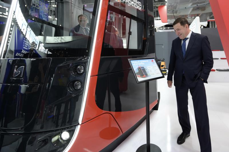 Обход стенда Свердловской области начался с презентации важнейшего для региона проекта — первой в России межмуниципальной трамвайной линии Екатеринбург-Верхняя Пышма. Это проект государственно-частного партнёрства правительства региона и компании «Верхнепышминский трамвай». В рамках проекта построено трамвайное депо, закуплены 11 низкопольных трамваев. Протяжённость линии между Екатеринбургом и Верхней Пышмой — 18 километров.
