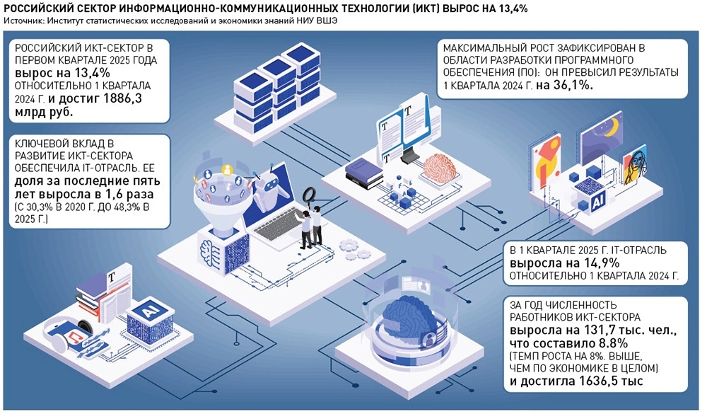Российская IT-отрасль растет в два раза быстрее экономики в целом. За первый квартал 2025 года IT-рынок увеличился почти на 15%. Растут продажи, зарплаты и число специалистов.