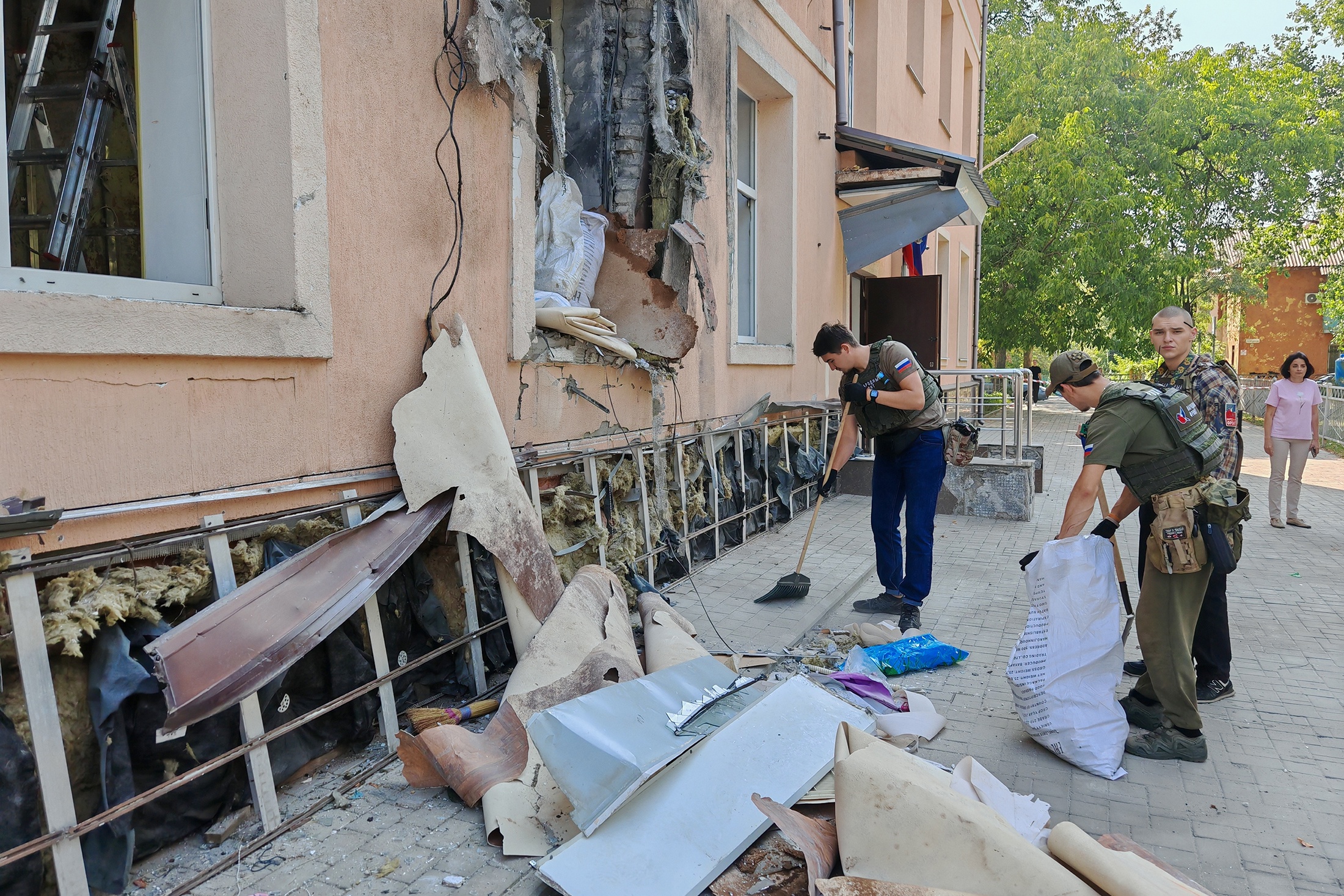 Волонтеры выбросили из разбитых кабинетов обломки и теперь сметают разбитое стекло. Печальный звук разносится по школьному двору.