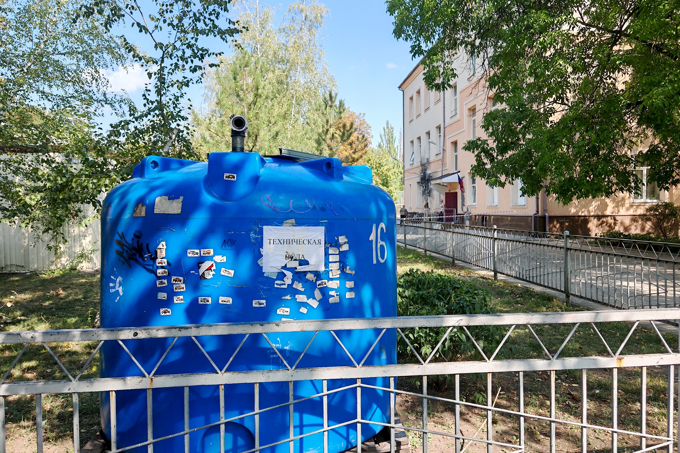 Сразу у входа в учебное заведение бросается в глаза бочка с водой - характерная особенность Донецка, изнывающего от жажды. Водопроводная вода есть не везде, поэтому по городу ее развозят в такие бочки, установленные на улицах.