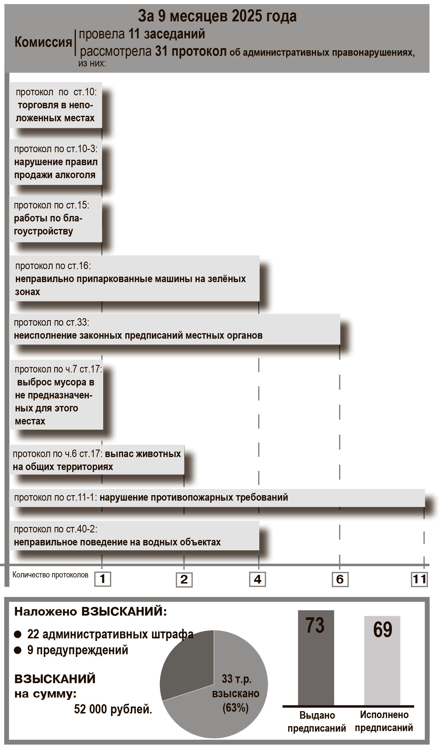 По результатам рассмотрения дел было наложено 22 штрафа и вынесено девять предупреждений, общая сумма взысканий составила 52 тысячи рублей. Из этой суммы 33 тысячи рублей уже оплачено — это около 63%. Также выдано 73 предписания, из которых почти все (69) исполнены. Остальные дела находятся на контроле службы судебных приставов — там сейчас 12 тысяч рублей задолженности по штрафам, срок добровольной оплаты по некоторым постановлениям уже истёк.