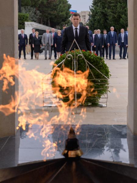 Губернатор Евгений Куйвашев и члены делегации Свердловской области 11 сентября в Баку возложили цветы к могиле общенационального лидера Азербайджанской Республики, третьего Президента государства Гейдара Алиева и к Вечному огню. В торжественно-траурной церемонии принял участие заместитель министра экономики Азербайджана Сахиб Мамедов.