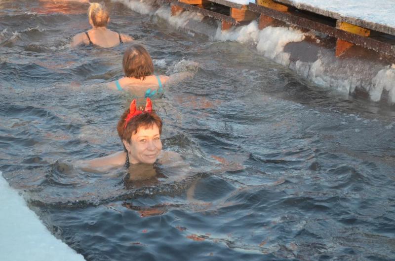 Непреклонно следуя ему, невьянцы один за другим совершили заплыв в проруби на водной станции. Примечательно, что среди более чем двадцати человек почти половину составили женщины — самые обаятельные, привлекательные и закаленные, не первый год занимающиеся в «Норде». Что уж говорить о мужчинах, которые, несмотря на температуру воздуха (в тот день было существенное понижение до –20 градусов), смело бросались в воду и автоматически становились участниками общероссийской акции.