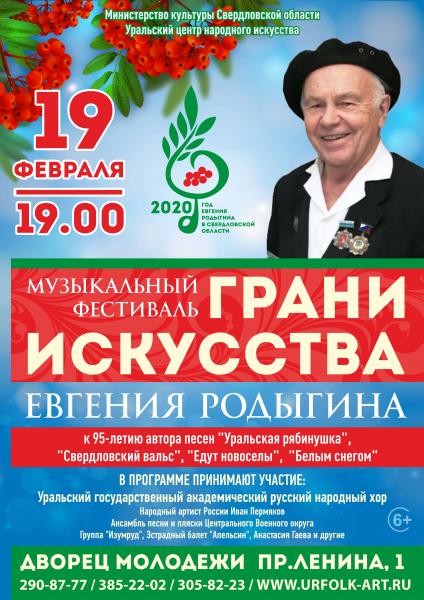 Участниками фестиваля «Грани искусства Евгения Родыгина», посвященного торжественному открытию Года Е.П. Родыгина в Свердловской области, станет Уральский государственный академический русский народный хор, народный артист России Иван Пермяков, Ансамбль песни и пляски Центрального военного округа, артисты Свердловского государственного академического театра музыкальной комедии, группа «Изумруд», эстрадный балет «Апельсин» и вокалистка Анастасия Гаева. Концертная программа первого отделения фестиваля представляет собой «путешествие» из современного Екатеринбурга в город Свердловск – во времена начала творческого становления уральского композитора. Во втором отделении фестиваля будет представлена концертная программа Уральского русского народного хора «Легенда Урала», которая является номинантом на премию губернатора Свердловской области за выдающиеся достижения в области литературы и искусства по итогам 2019 года.