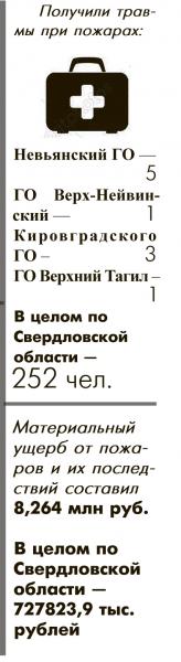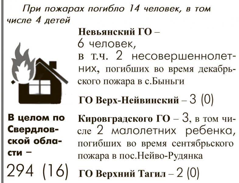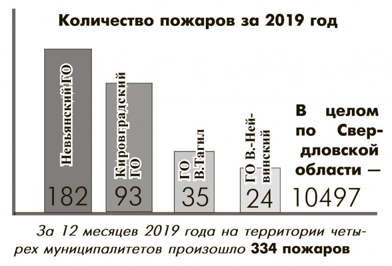 Позади еще один год — 2019-й. К сожалению, и он не был лишен пожаров: небольших и крупных, без пострадавших и с гибелью людей. Сколько их было, какой ущерб они принесли? — ответы на эти вопросы даст годовая статистика, подготовленная сотрудниками отдела надзорной деятельности и профилактической работы 13 ОФПС по Свердловской области, обслуживающего четыре территории: Невьянский, Кировградский городские округи, городские округи Верх-Нейвинский, Верхний Тагил.
