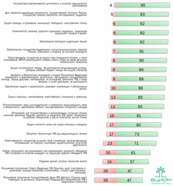 Среди конкретных поправок, предложенных для оценки нашим соотечественникам, наиболее важной россияне считают со стороны государства обеспечить доступность и качество медицинского обслуживания (95%). Также значимо для россиян признание детей приоритетным направлением государственной политики и обязательное предоставление им социальной поддержки (93%).