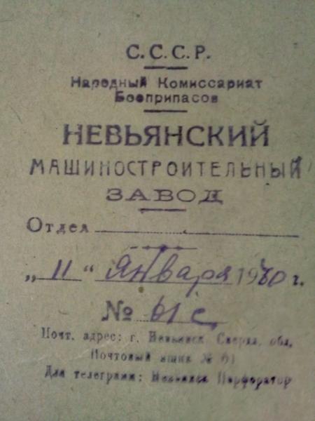 Невьянский машиностроительный завод — Завод под №68 — входил в номерной 30-й Главк. С 1 июля 1941 года он перешел на непрерывный 12-часовой график работы. Выпускал корпуса артиллерийских снарядов для среднекалиберной артиллерии: 76-мм полковых, дивизионных, зенитных пушек, 85-мм зенитных и танковых пушек, 82-мм реактивные снаряды М-8. Не менее 15% от всего количества тех снарядов были родом из нашего Невьянска, каждый седьмой-шестой. А в 1941-ом, наверное, и почаще …После ухода в действующую армию мужчин к станкам встали старики, женщины и подростки. Невьянский машиностроительный производил корпуса для снарядов РС — знаменитых «Катюш». Это их вклад в Победу уже 20 января 1942 года был отмечен орденом Трудового Красного Знамени, в 16 сентября 1945 года — орденом Ленина. За весь военный период Невьянский машиностроительный завод по Наркомату боеприпасов восемнадцать раз занимал призовые места, и неоднократно ему вручалось Знамя ЦК ВКП (б).