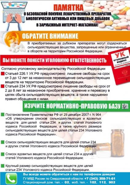 «В приобретаемых за рубежом препаратах могут содержаться сильнодействующие вещества, запрещенные или ограниченные в обороте на территории Российской Федерации. Купив, к примеру, отдельные лекарственные препараты, биологические или пищевые добавки, покупатель может столкнуться с серьезными неприятностями, вплоть до лишения свободы на длительный срок. Прежде чем приобретать товары через интернет, необходимо тщательно изучить законодательство нашей страны по данному вопросу, чтобы четко понимать, что можно и что нельзя покупать», - отметил полковник Горелых.