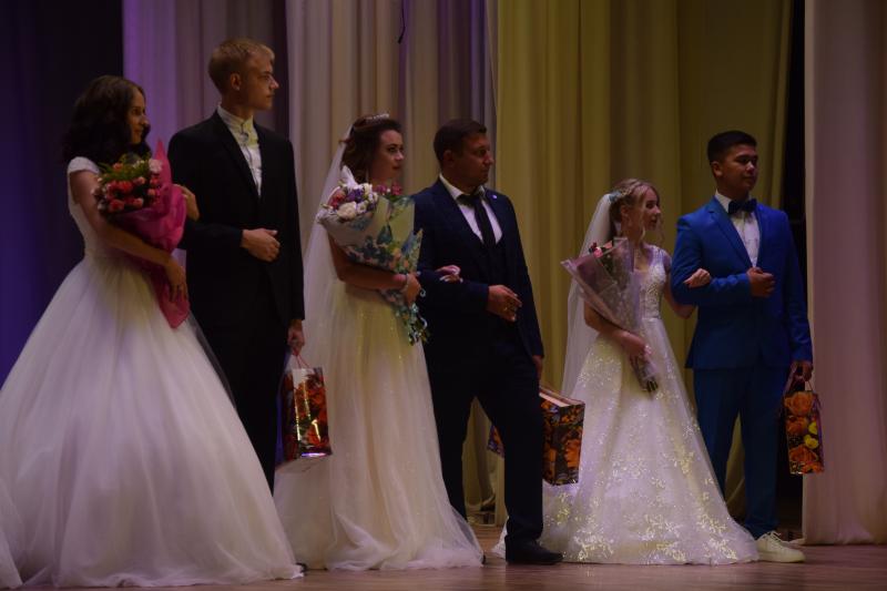 Праздничная встреча открылась приветствием заместителя главы округа Станиславом Делидовым и… шествием молодоженов, заключивших накануне Дня города свой брак. Молодые семьи Казиных, Наприенко, Шаталиных, Степановых и Белоусовых на сцене ДК бурно приветствовали все собравшиеся в зале. В ответ состоявшиеся мужья и жены подарили им свадебный танец, после чего Станислав Леонидович вручил каждой паре цветы и памятный подарок.