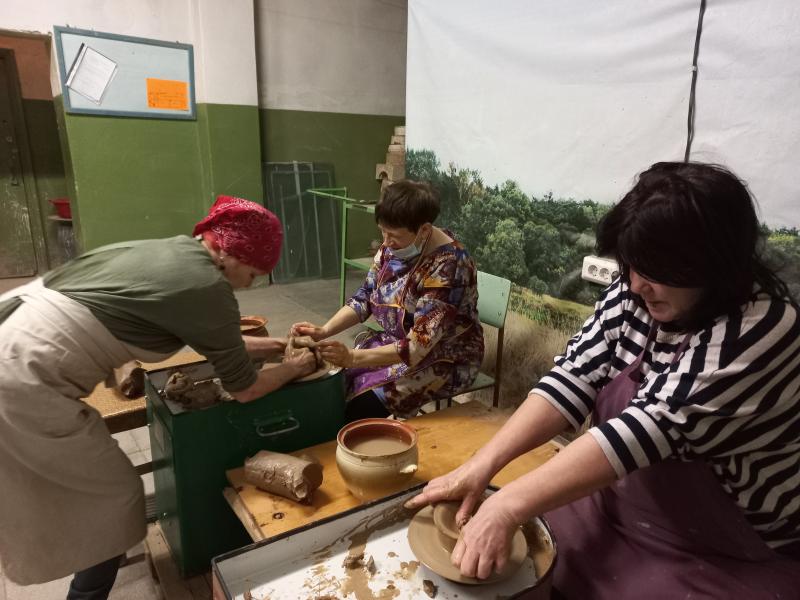 Елена Петровна Мезянкина рассказала о работе гончарного цеха, показала, как происходит обжиг гончарных изделий и изумрудная обработка посуды.