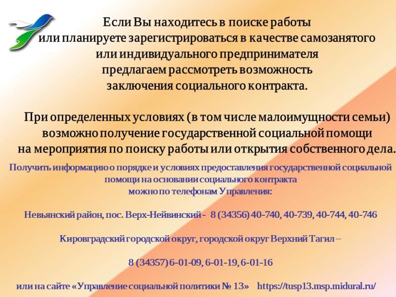 Получить более подробную информацию о порядке и условиях предоставления государственной социальной помощи на основании социального контракта можно по телефонам управления социальной политики №13: 8(34356) 40-739, 40-744, 40-746.