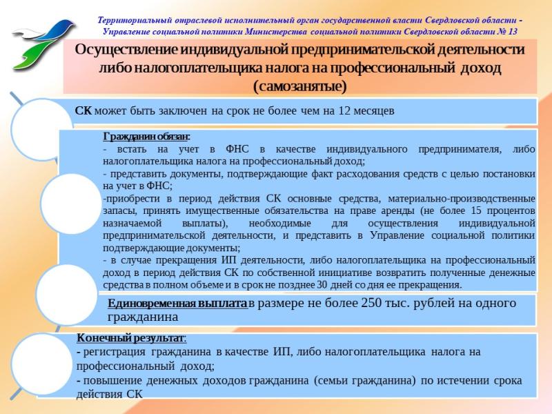 - представить в орган социальной защиты населения документы, подтверждающие факт расходования средств с целью постановки на учет в качестве индивидуального предпринимателя;