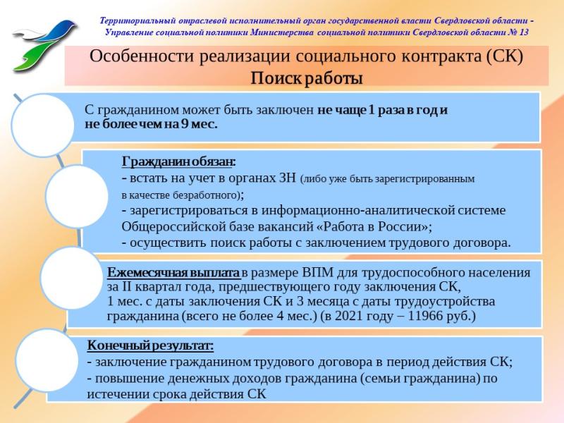 В целях содействия в поиске работы социальный контракт с гражданином может быть заключен не более чем на 9 месяцев. По условиям контракта гражданин обязан встать на учет в органах занятости населения (либо уже быть зарегистрированным в качестве безработного); зарегистрироваться в информационно-аналитической системе Общероссийской базе вакансий «Работа в России»; осуществить поиск работы с заключением Трудового договора.