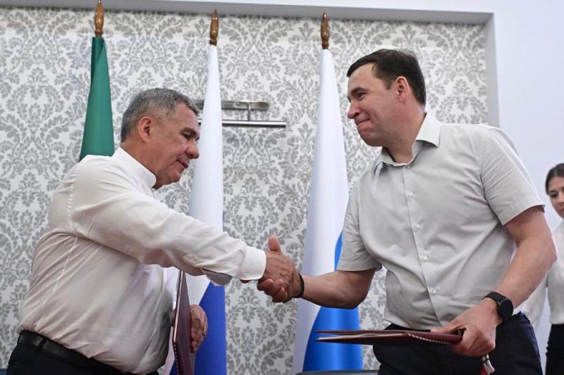 Губернатор Свердловской области Евгений Куйвашев и президент Республики Татарстан Рустам Минниханов 3 июля подписали план мероприятий по реализации соглашения о сотрудничестве между регионами. Церемония прошла на полях празднования областного Сабантуя.