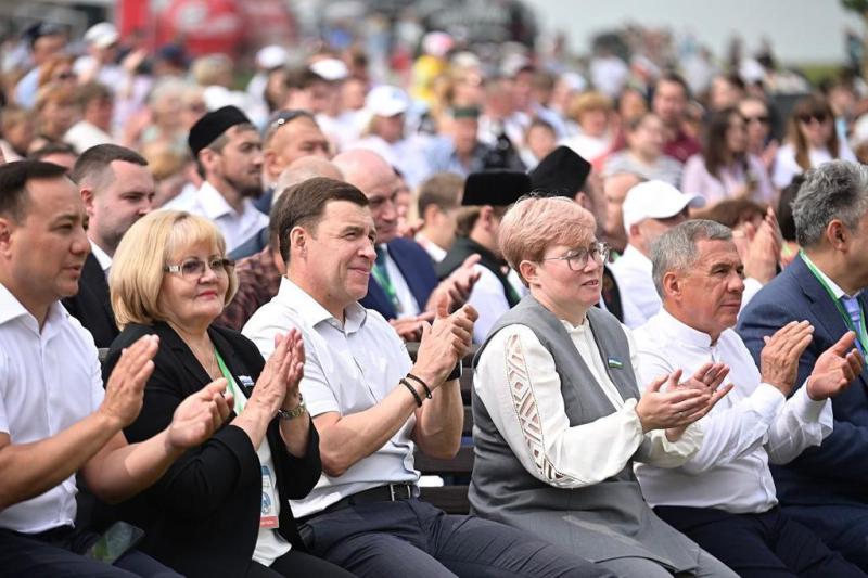 На главной сцене Сабантуя сегодня поют и танцуют лучшие творческие коллективы республик Татарстан и Башкортостан. На большом поле расположились 20 национальных подворий, гостями которых стали Евгений Куйвашев и Рустам Минниханов.