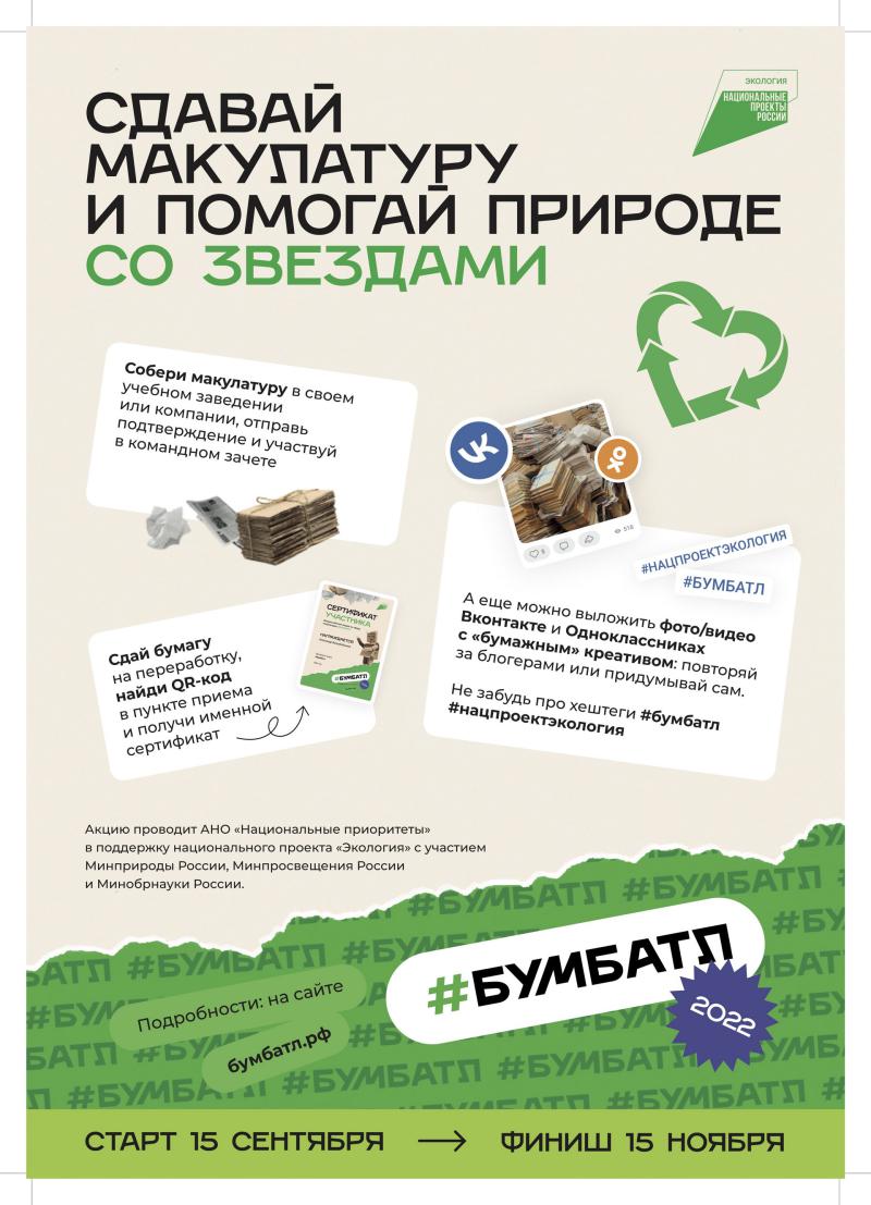 Акция #Бумбатл проходит по инициативе АНО «Национальные приоритеты» при поддержке Министерства природных ресурсов и экологии РФ, Министерства просвещения РФ, Министерства науки и высшего образования РФ. #БумБатл реализуется в поддержку национального проекта «Экология». Партнерами проекта выступают Ассоциация «Чистая страна», ППК «Российский экологический оператор», «Молодежка ОНФ», «Лига переработчиков макулатуры», сервис Ubirator, Общероссийская общественно-государственная детско-юношеская организация «Российское движение школьников».