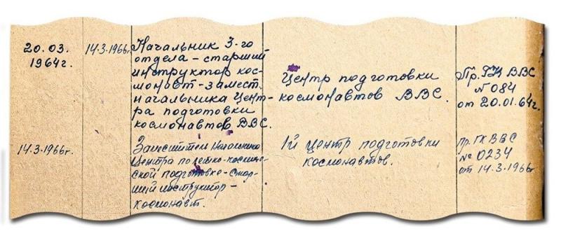 И вот теперь гриф секретности снят. Об уникальных документах, которые подшиты в личное дело, рассказал журнал "Русский космос". Здесь анкета, информация о семейном положении, характеристики. Когда стал комсомольцем и когда вступил в партию, указаны номера комсомольского и партбилета. Здесь таблица "Прохождение действительной военной службы в Советской армии...", список должностей в отряде космонавтов. Есть выписки из экзаменационных ведомостей...