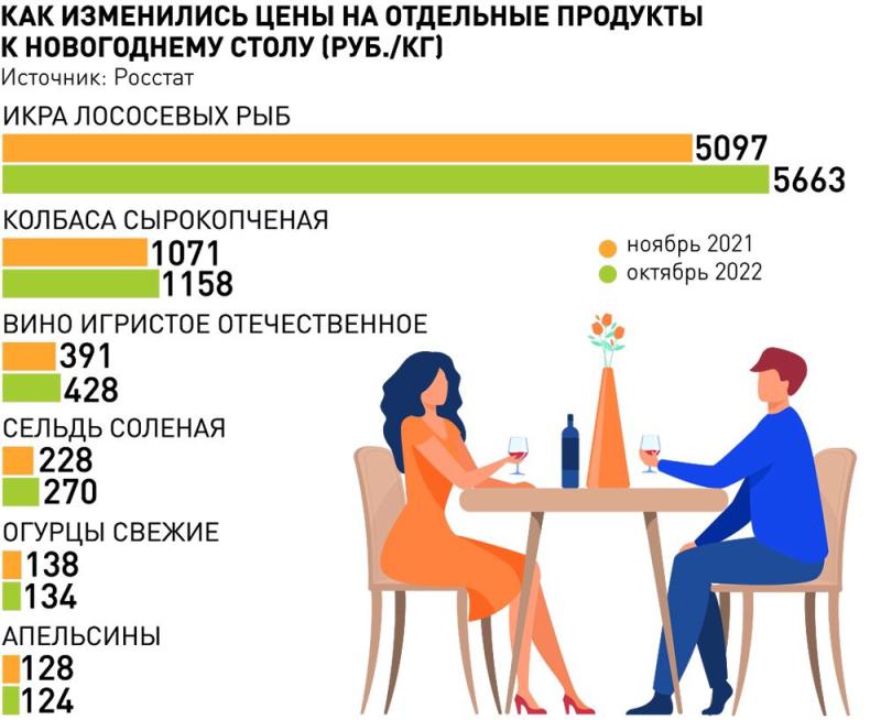 Самым дорогим продуктом для праздничного стола (в расчете за кг) является красная икра. По данным Росстата, в октябре 2022 года она стоила в среднем около 5,7 тыс. рублей, подорожав за год примерно на 12%. К 21 ноября добыто более 272 тыс. тонн горбуши, кеты, нерки, кижуча, чавычи и симы - это на 9% меньше, чем в прошлом нечетном году. Из улова этого года может быть произведено 13-14 тыс. тонн икры - это естественный для российского рынка объем с учетом общего снижения доходов и роста цен на другие товары из продуктовой корзины, считает президент Всероссийской ассоциации рыбопромышленников (ВАРПЭ) Герман Зверев.