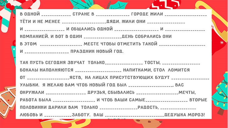 Предложите своим домашним и гостям поздравить друг друга и сказать большой и красивый тост — поздравление от Деда Мороза. В ваших руках будет открытка, на которой не хватает прилагательных, гости должны их подсказать. Все вразнобой должны предлагать прилагательные, связанные с зимой, Новым годом и праздником, а ведущий их записывает и после этого зачитывает результат. Вот текст телеграммы: