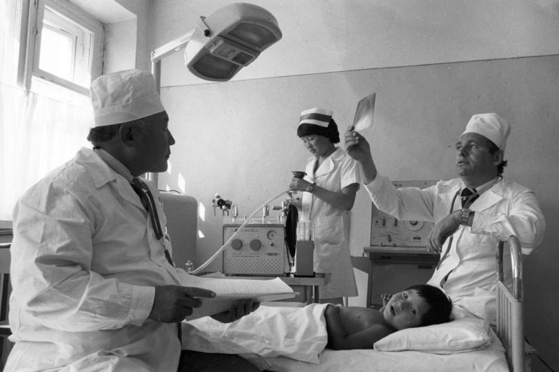1980 год. Руководитель группы советских детских врачей в МНР, доктор медицинских наук Леонид Рошаль (справа) осматривает пациента. Детская городская больница в Улан-Баторе. Фото: Сергей Субботин/ РИА Новости
