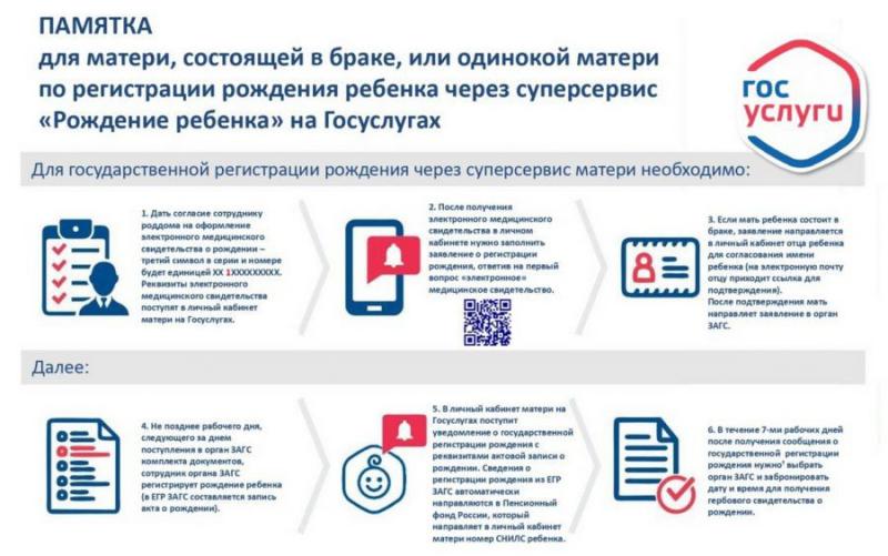 Если родители состоят в браке, то заявление поступит супругу на согласование, а после — на регистрацию в органе ЗАГС. Если ребёнок родился не в браке, то после регистрации рождения в электронном виде можно будет зарегистрировать установление отцовства в органах ЗАГС.