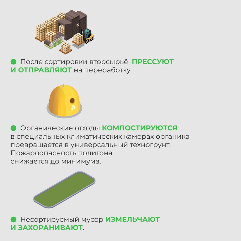 — Органика выбирается отдельно и уходит на участок компостирования – в такие отходы «замешивается» специальная микрофлора, их ворошат, высушивают. Этот процесс, в зависимости от технологии, может занимать от нескольких недель до нескольких месяцев. В итоге масса превращается в техногрунт, который можно использовать для рекультивации полигона. В нем уже не идёт процесс гниения, из него в атмосферу не выделяется метан, в нём не повышается температура, нет запахов, объём меньше.