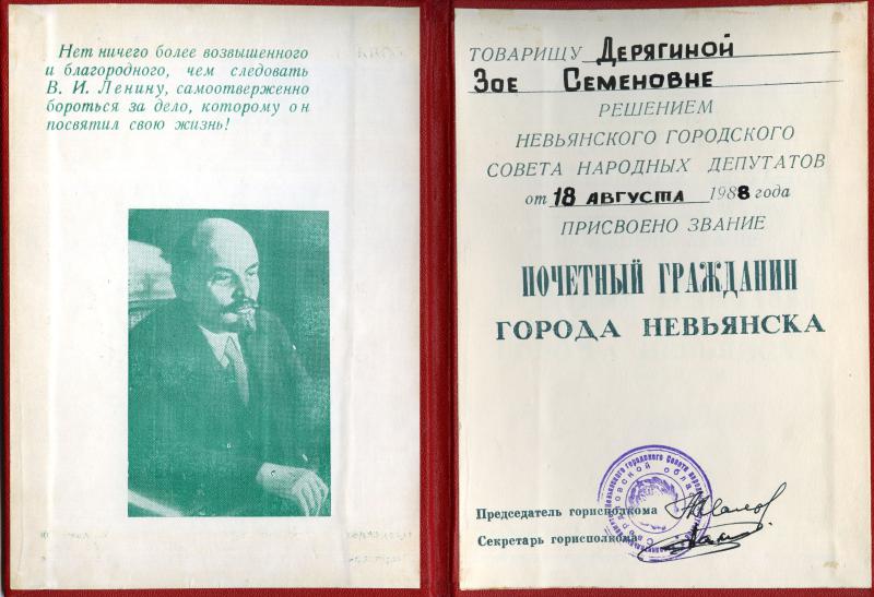Осенью 1976 года в Невьянске было учреждено звание «Почетный гражданин города Невьянска». Спустя 12 лет, 18 августа 1988 года, это звание было присвоено Отличнику народного просвещения, Заслуженному учителю РСФСР Зое Семеновне Дерягиной. В Год педагога и наставника в канун Дня города хочется рассказать об этом замечательном человеке.