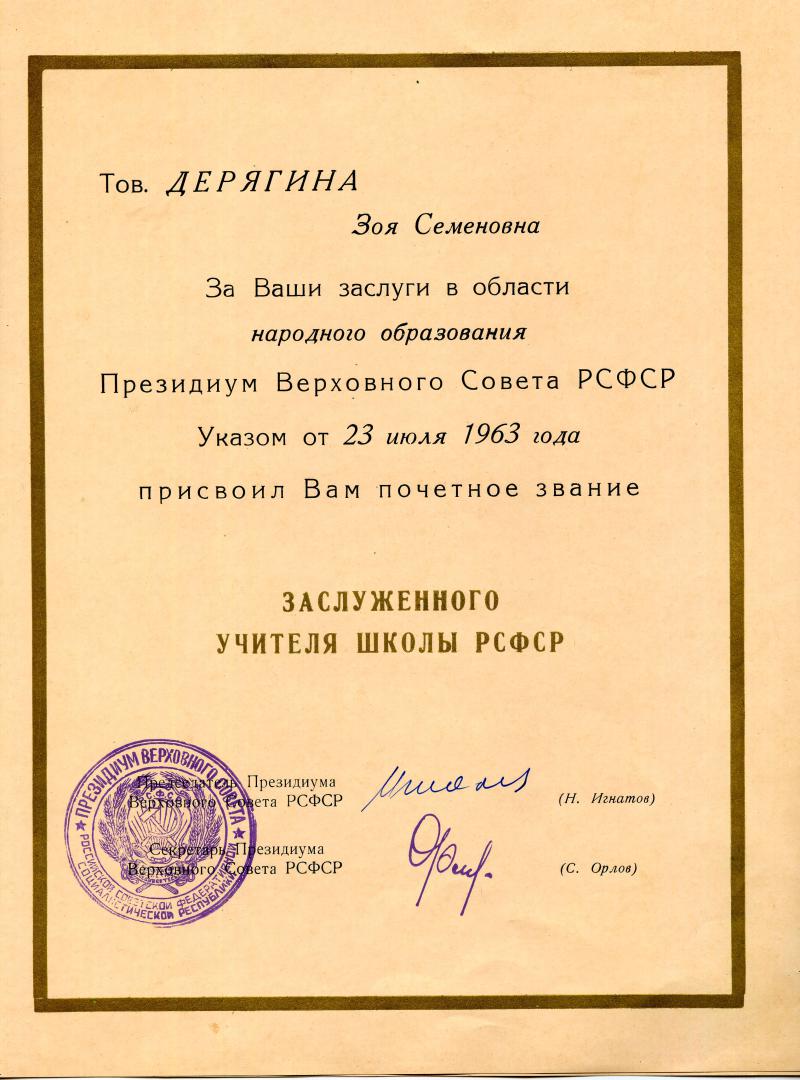 Зоя Семеновна, прожив достойную жизнь, ушла из нее, когда ей было 74. Она воспитала не одно поколение невьянцев, которые сохранили о ней добрую память. За большой вклад в воспитание молодежи города Невьянска 18 августа 1988 года З.Дерягиной было присвоено звание «Почетный гражданин города Невьянска».
