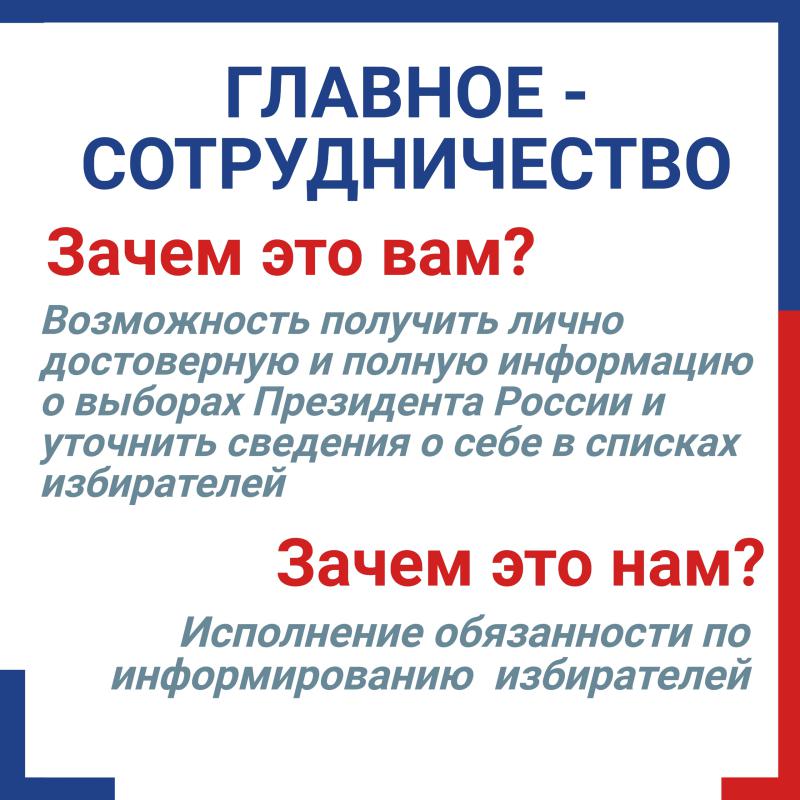 Совсем скоро, с 17 февраля по 7 марта, организаторы выборов проведут адресное информирование избирателей — начнутся поквартирные (подомовые) обходы. Члены участковых избирательных комиссий придут к избирателям на дом, чтобы рассказать о главных выборах страны. Избиратели смогут получить полную информацию о способах и формах голосования на выборах Президента России, уточнить адрес и телефон своей участковой избирательной комиссии.