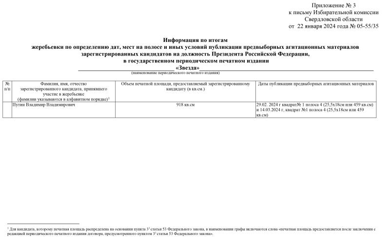 Информация по итогам жеребьевки по определению дат, мест на полосе и иных условий публикации предвыборных агитационных материалов зарегистрированных кандидатов на должность Президента Российской Федерации, в государственном периодическом печатном издании «Звезда»