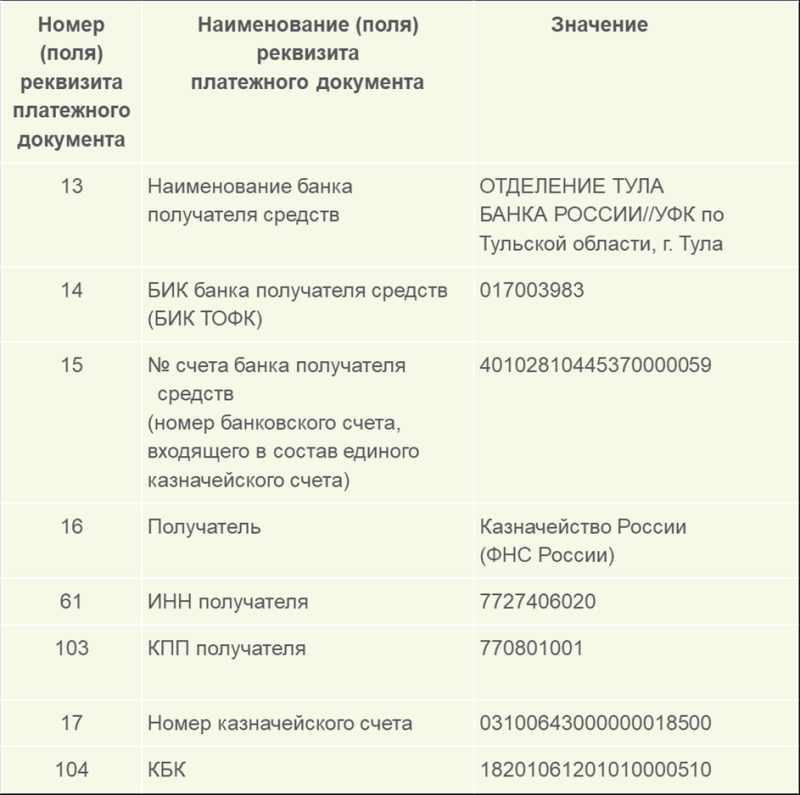 Получатель – Казначейство России (ФНС России).
