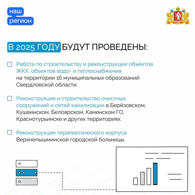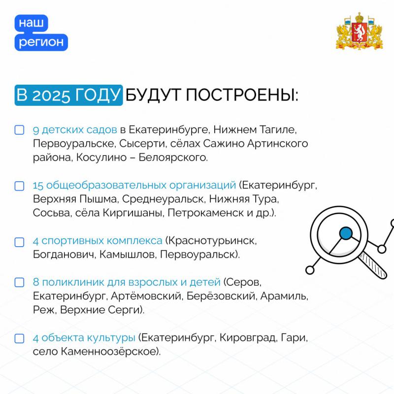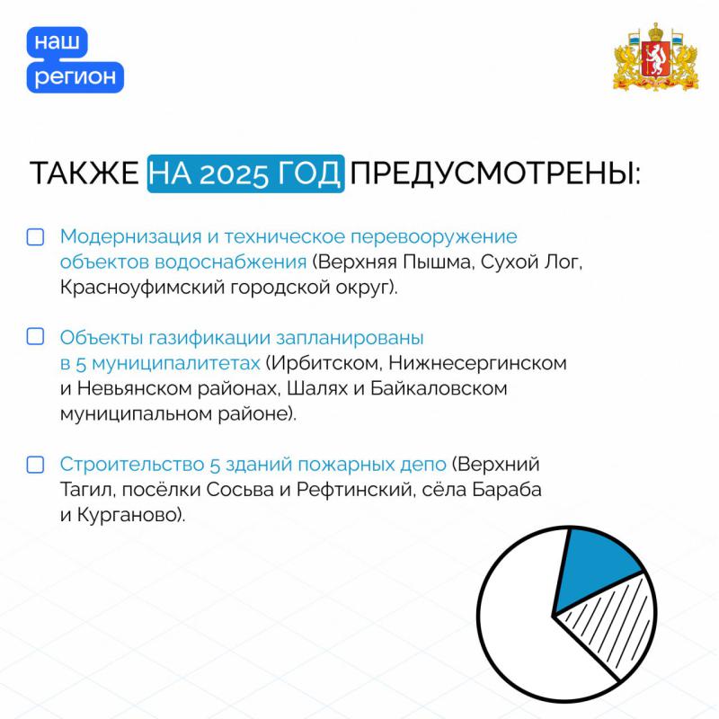 На финансирование капитальных расходов будет направлено более 40 миллиардов рублей. В «инфраструктурной» части бюджета заложены средства на возведение 9 детских садов в Екатеринбурге, Нижнем Тагиле, Первоуральске, Сысерти, селах Сажино и Косулино. Кроме того, будет построено 15 общеобразовательных организаций в Екатеринбурге, Верхней Пышме, Среднеуральске, Нижней Туре, Сосьве и других муниципалитетах региона. В планах также создание четырёх новых спортивных комплексов в Краснотурьинске, Богдановиче, Камышлове, Первоуральске, а также восьми поликлиник в Серове, Екатеринбурге, Артёмовском, Берёзовском, Арамили, Реже и в посёлке городского типа Верхние Серги и реконструкция терапевтического корпуса Верхнепышминской городской больницы.