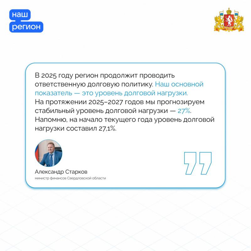 В будущем году регион продолжит проводить ответственную долговую политику. Как уточнил министр финансов Свердловской области Александр Старков, «наш основной показатель – это уровень долговой нагрузки. На протяжении 2025–2027 годов мы прогнозируем стабильный уровень долговой нагрузки – 27%. Напомню, на начало текущего года уровень долговой нагрузки составил 27,1%. И сегодня госдолг находится на экономически безопасном уровне для нашего региона», – подытожил Старков.