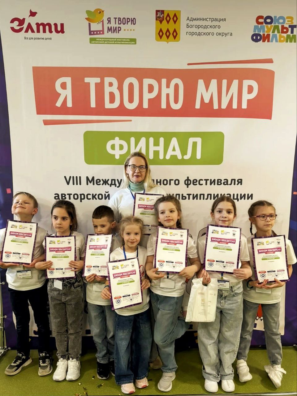 Мультфильмы МАДОУ детсада «Карусель» уже третий раз блистают на фестивале. Первые два года дошкольное учреждение отправляло по одному мультфильму, а в 2025-м — аж 13! Среди 730 мультфильмов и более 4000 юных мультипликаторов из Беларуси, Казахстана и 59 регионов нашей страны в финал прошли шесть мультфильмов мультстудии «Карусель», и юные мультипликаторы из Невьянска были приглашены управлением образования Богородского городского округа Московской области на очный этап суперфинала в г.Ногинск. Такое масштабное мероприятие в очном формате с детьми проводилось впервые! Дошкольным учреждением при поддержке родителей было принято решение поехать, и дети вместе со своим руководителем Светланой Викторовной Нечаевой отправились в г.Ногинск Московской области.